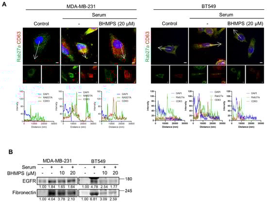 Considering the role of Rab27a in vesicle transport and exocytosis, the intracellular localization of Rab27a and CD63 was examined. A member of the tetraspanin superfamily, CD63, is highly enriched in late endosomal MVBs and exosomes [20]. Serum stimulation induced co-localization of CD63 and Rab27a near the plasma membranes of TNBC cells, while BHMPS accumulated CD63 in the perinuclear region and markedly attenuated this co-localization in the plasma membrane (Figure 5A). These results suggest that Rab27a inhibition by BHMPS could suppress the transport of vesicles to the plasma membrane and secretion. Since EGFR and FN are considered clinically relevant exosome protein markers for breast cancer [21], the expression of EGFR and FN in the conditioned medium was examined. Serum stimulation significantly increased the release of EGFR and FN, and BHMPS effectively suppressed their release (Figure 5B).