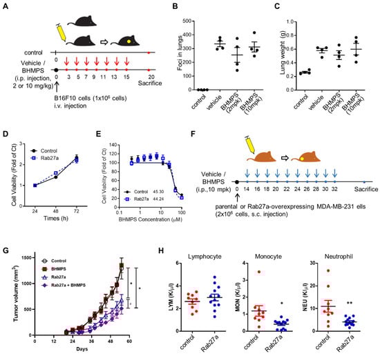 To investigate whether the above results could be replicated in vivo, the antitumor effect of BHMPS was evaluated in an experimental lung metastasis model of B16F10 melanoma. BHMPS administration did not show any antimetastatic effects (Figure 6A–C). Similarly, tumor growth or metastasis was not affected by BHMPS in the MDA-MD-231 cell xenograft mouse model and the spontaneous metastasis model of 4T1/luc cells (data not shown). Therefore, we further examined tumor growth in Rab27a-overexpressing MDA-MB-231 cell xenograft mice with elevated levels of Rab27a. The viability of Rab27a-overexpressed cells was similar to that of the control parental cells, and the GI50 value of BHMPS did not differ between the two cells (Figure 6D,E). Interestingly, tumor growth in mice transplanted with Rab27a-overexpressing cells was significantly delayed compared to that of the parental control cells, and BHMPS was shown to inhibit tumor growth only in Rab27a-overexpressing tumors (Figure 6F,G). To determine whether this phenomenon is related to tumor immunity, a complete blood count (CBC) analysis was performed. The number of monocytes and neutrophils were significantly decreased in Rab27a-overexpressing tumor xenograft mice compared to the control group (Figure 6H). The number of lymphocytes, red blood cells and platelets was not different between the two groups.