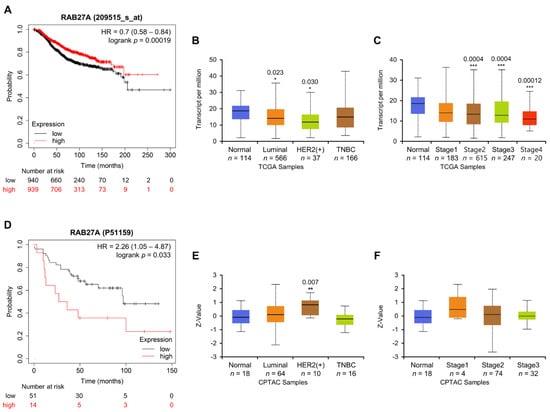 Clinical significance of Rab27a mRNA and protein expression levels. (A) Effect of Rab27a mRNA on OS of breast cancer patients, using Kaplan-Meier Plotter analysis. The image with the lowest logrank p value is represented. The red and black lines indicate high and low Rab27a expression, respectively. (B,C) Rab27a mRNA expression levels in (B) major subclasses of breast cancer or (C) different breast cancer stages were analyzed with the UALCAN tool using TCGA BRCA dataset. (D) the overall survival rate of breast cancer patients based on Rab27a expression at the protein level was analyzed using the Kaplan-Meier Plotter. (E,F) The expression level of Rab27a protein according to (E) major subclasses or (F) stages of breast cancer was analyzed with UALCAN tool using the CPTAC breast cancer dataset. Boxplot represents median with upper and lower quartiles, and the bars represent the maximum and minimum values. Compared with the normal tissue control group, statistically significant differences were indicated as * p < 0.05, ** p < 0.01, and *** p < 0.001.