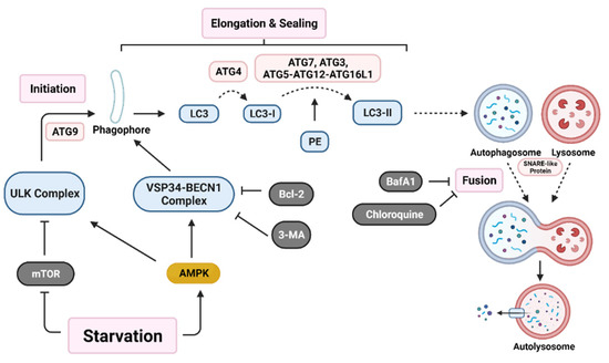 Autophagy activation pathway. Nutrient deprivation induces nucleation of the phagophore through activation of both the Unc-51 like autophagy activating kinase (ULK) complex and the vacuolar protein sorting 34-beclin 1 (VSP34-BECN1) complex. Various autophagy related gene (ATG) proteins work together to elongate and seal the phagophore through cleavage of microtubule-associated protein light chain 3 (LC3) into LC3-I and conjugation with phosphatidyl-ethanolamine (PE) to form LC3-II. Lastly, SNARE-like proteins aid in the fusion of autophagosomes with lysosomes resulting in an autolysosome. Various proteins (B-cell lymphoma 2 (Bcl-2)) and drugs (3-methyladenine (3-MA), bafilomycin A1 (BafA1), and chloroquine) are able to inhibit early-stage or late-stage autophagy induction. (Created with BioRender.com, accessed on 11 October 2021).