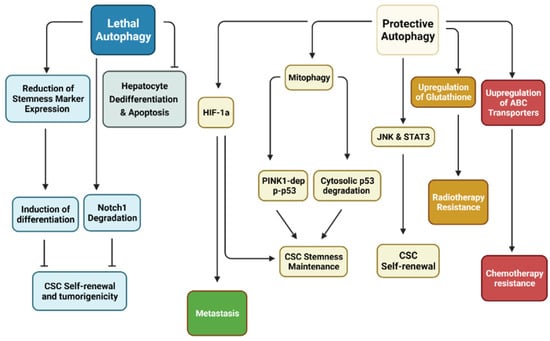 Relationship between autophagy with CSCs. Research has demonstrated that autophagy may be separated into two distinct categories in cancer stem cells (CSCs). Protective autophagy enhances CSC characteristics, including stemness maintenance through Pten-induced putative kinase 1 (PINK1)-dependent inactivation of p53 but also degradation of cytosolic p53. CSC self-renewal is dependent on Jun N-terminal kinase (JNK) and signal transducer and activator of transcription 3 (STAT3). Hypoxia-inducible factor-1α (HIF-1α)-dependent autophagy has been shown to enhance CSC stemness while promoting metastasis. CSC resistance to various treatment modalities revolves around upregulation of antioxidants to remove reactive oxygen species (ROS) and ATP-binding cassette (ABC) transporters to efflux anti-cancer drugs. On the other hand, lethal autophagy inhibits CSC self-renewal through degradation of Notch1 and reduction of stemness markers. Inhibition of this form of autophagy has been shown to induce tumorigenesis. (Created with BioRender.com, accessed on 11 October 2021).