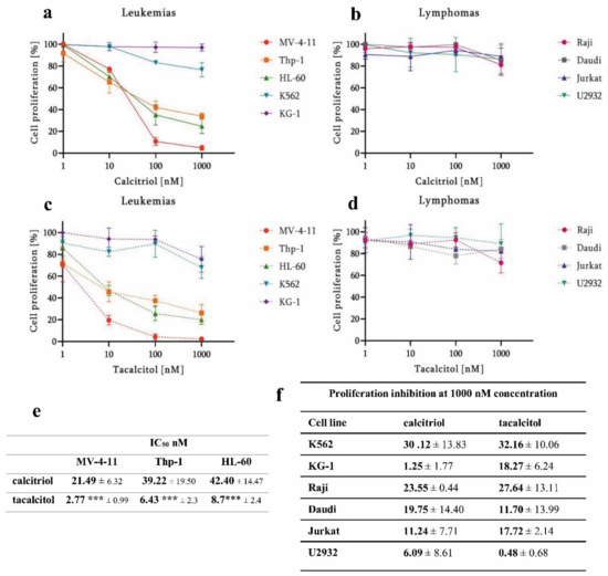 The MTT proliferation assay was used to determine leukemia and lymphoma cells’ response to calcitriol and tacalcitol. The results showed that myeloid cancer cells were significantly more sensitive to calcitriol and tacalcitol compared to lymphoid cancer cells (Figure 1a–d).