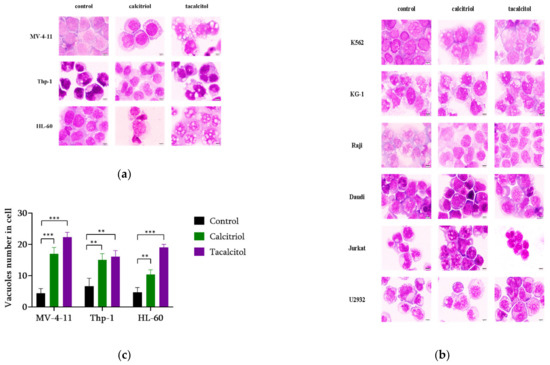 Human leukemia cells. Sensitive to calcitriol and tacalcitol MV-4-11, Thp-1, and HL-60 cells showed changes in cell morphology and numbers of vacuoles (a,b). Other lymphoma and leukemia cells were insensitive to calcitriol and tacalcitol. There were no changes in the morphology of these cells (c). May–Grunwald, Giemsa staining (the scale corresponds to 5 μm). Vacuole numbers (mean ± standard deviation). ** p <0.05 *** p <0.01 statistical significance to the control.