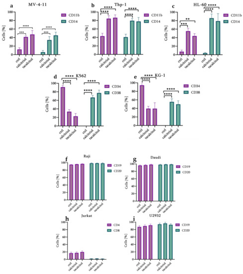 CD11b and CD14b antigens in MV-4-11 (a), Thp-1 (b), and HL-60 (c) cells sensitive to calcitriol and tacalcitol. CD34 and CD38 antigen levels in K562 (d) chronic myeloid leukemia and KG-1 (e) acute myeloid leukemia cells. CD19 and CD20 antigens in the cells of Burkitt Raji lymphoma (f), Burkitt Daudi lymphoma (g) and diffuse large B-cell lymphoma U2932 (i). CD4 and CD8 antigens levels in acute leukemia cells from Jurkat T cells (h). Analysis of surface antigens level after 120 h of incubation with 10 nM calcitriol and tacalcitol (mean ± standard deviation). ** p < 0.05, *** p < 0.01, **** p < 0.0001 statistical significance to the control.