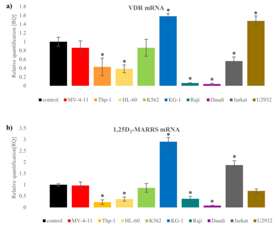 mRNA level of vitamin D binding receptors: classical vitamin D receptor (VDR) (a) and 1,25D3-MARRS (b) in human leukemia and lymphoma cells. The mRNA level was compared to the control level of normal blood cells. *—statistical significance (p < 0.05) in relation to the control.