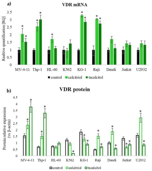 The level of mRNA and protein after incubation with calcitriol and tacalcitol was also examined. Cells were incubated for 120 h with vitamin D analogs. Interestingly, MV-4-11, Thp-1, and HL-60 VDR mRNA levels increased after treatment in all three sensitive cell lines. A similar effect was observed in two insensitive cell lines, KG-1 and Raji. Other tested cell lines did not show the changes in VDR mRNA level (Figure 6a). The VDR protein level analysis showed that calcitriol caused a significant increase in the level in both sensitive cells MV-4-11, Thp-1, and insensitive cells Raji, Daudi, and U2932. Interestingly, no changes in the level of VDR in sensitive HL-60 cells were observed after calcitriol and tacalcitol treatment (Figure 6b). We did not observe any correlation in the change in the level of VDR mRNA and protein compared to inhibition of proliferation (Western blots and densitometry analysis after 24, 48, 72, 96, and 120 h of treatment placed in Supplementary Materials (Figure S1b,c)).