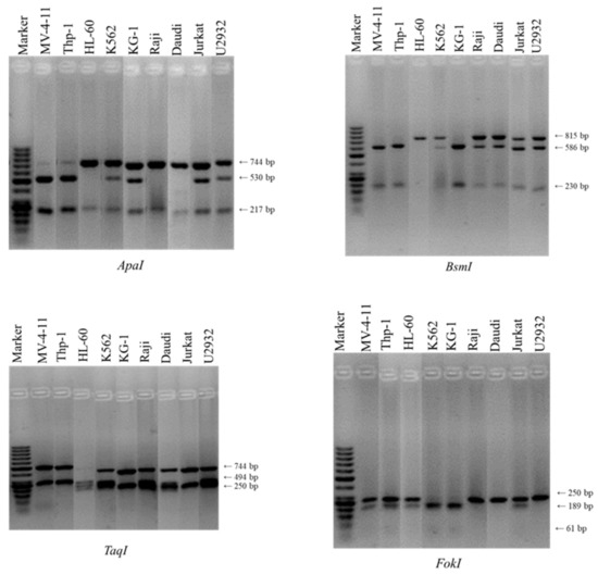 Genomic DNA was extracted from human leukemia and lymphoma cell lines (3 × 106 cells) using the NucleoSpin® Blood Kit (Macherey-Nagel INC, Bethlehem, PA, USA). The amount and quality of DNA were estimated with the use of the NanoDrop 2000 spectrometer (ThermoFisher Scientific, Waltham, MA, USA). Vitamin D receptor gene polymorphisms were analyzed employing polymerase chain reaction (PCR) amplifications, followed by restriction fragment polymorphism length analyses (RFLP) with FokI, BsmI, ApaI, and TaqI restriction enzymes. The primers used for the PCR-RFLP assays were synthesized by the DNA Sequencing and Synthesis Laboratory (Institute of Biochemistry and Biophysics of the Polish Academy of Sciences, Warsaw, Poland). A minimum of 3 independent tests were performed. The primer sequences were as follows: