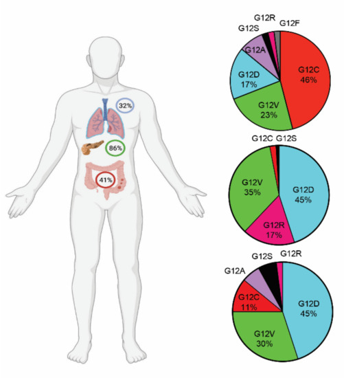 Figure 1. KRAS-G12 substitutions in lung (top), pancreatic (middle), and colon (bottom) cancers. Data are based on patient cohorts in TCGA.