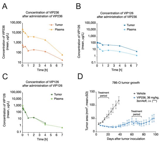 2.7. Pharmacokinetics of VIP236 and VIP126 in Plasma and Tumor