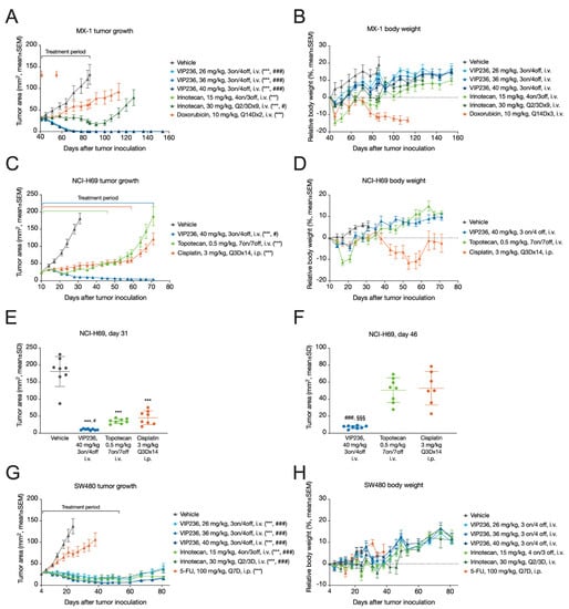 | VIP236, 40 mg/kg, 3 on/4 off | 10 | CR: 7/8, PR: 1/8 | 0.001 ***, ### |