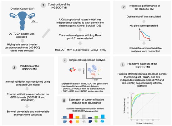 Schematic of the bioinformatics workflow. First, The Cancer Genome Atlas (TCGA) ovarian cancer (OV) dataset was accessed, and the high-grade serous ovarian carcinoma cases were selected. A Cox proportional hazard model was used to identify matrisome-associated prognostic genes. The HGSOC-TMI risk score was computed, and two risk groups were identified by using an optimal cutoff. The overall survival probabilities for each risk group are shown in Kaplan–Meier (KM) plots. The HGSOC-TMI risk score was internally and externally validated by using two independent GEO datasets. A machine-learning-based deconvolution tool (CIBERSORTx) was then used to investigate the abundance of infiltrating immune cells for each risk group. Finally, machine-learning multiclass supervised classification was performed to test the predictive abilities of the HGSOC-TMI across different platforms.