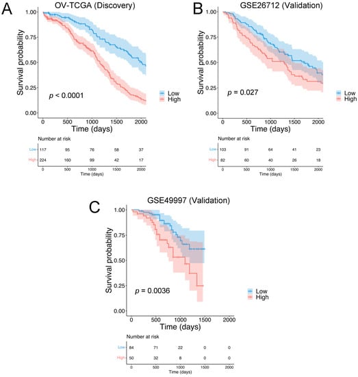 Identification of the HGSOC Tumor Matrisome Index (HGSOC-TMI) and its prognostic ability. Kaplan–Meier plots for the high-grade serous ovarian carcinoma (HGSOC) in the case of (A) the discovery set OV-TCGA (N = 341) and the following validation sets: (B) GSE26712 (N = 185) and (C) GSE49997 (N = 134).