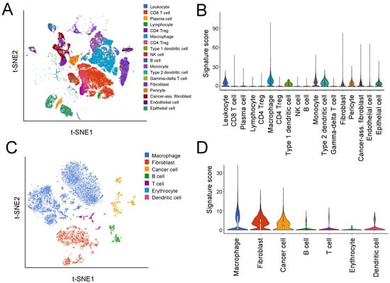 Expression of the HGSOC-TMI signature at the single-cell level. (A) A t-SNE plot from the scRNA-seq study by Hornburg et al. [16] (EGAS00001004935 dataset) on 15 ovarian cancer patients colored by cell type. (B) Relative expression of the HGSOC-TMI genes across different cell types. On the y-axis, the average expression of the HGSOC-TMI genes. (C) A t-SNE plot of 9609 droplet-based scRNA-seq profiles from eight samples of ovarian cancer ascites from Izar et al. [15], colored by cell type (GSE14602 dataset). (D) Relative expression of the HGSOC-TMI genes across different cell types.