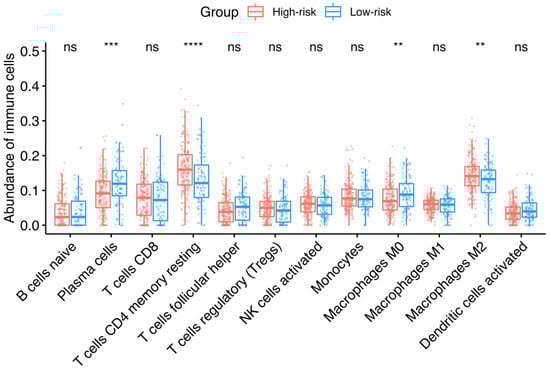 Infiltrating immune cells and HGSOC-TMI risk group. Median percentages of infiltrating immune cells were estimated between each risk group in the OV-TCGA dataset, using CIBERSORTx. The size of the boxes corresponds to the interquartile range (IQR = Q3 − Q1). The whiskers indicate the range from Q1 + 1.5 × IQR to Q3 − 1.5 × IQR. A two-sided unpaired two-sample Wilcoxon test was performed between the two groups: **** p ≤ 0.0001; *** p ≤ 0.001; ** p ≤ 0.01; ns, not significant.