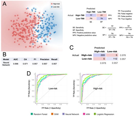 We sought to assess the predictive value of the HGSOC-TMI in discriminating between the risk groups, using a supervised machine-learning approach [30]. The t-distributed Stochastic Neighbor Embedding (t-SNE) plot in Figure 5A shows a clear separation between the two risk groups. Multiple computational predictive models were then trained on the OV-TCGA dataset (Figure 5). The predictive performance of each model was tested through 10-fold cross-validation. The best predictive model was the neural network, which achieved a classification accuracy of 97.1% and an AUC of 0.996, which is the area under the receiver operating characteristic (ROC) curve. The confusion matrix in Figure 5C shows the number of patients that are correctly predicted for each risk group. In Figure 5D, the ROC curves for each predictive model are shown.