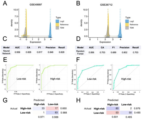 External validation of the computational classification of the HGSOC-TMI risk group. (A,B) Density plots of the TDM and log2-transformed training data (TCGA) against the validation datasets (GSE49997 and GSE26712). (C) Results of the neural-network model, which had the best score in the classification of the risk groups in the GSE49997 dataset. (D) Results of the random-forest model, that had the best score in the classification of the risk groups in the GSE26712 dataset. (E) Receiver operating characteristic (ROC) curves for two HGSOC-TMI risk groups for the GSE49997 and (F) GSE26712 datasets. (G,H) Confusion matrixes showing the number of patients correctly classified by using the best predictive model for each dataset.