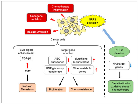 - Hayashi, M.; Kuga, A.; Suzuki, M.; Panda, H.; Kitamura, H.; Motohashi, H.; Yamamoto, M. Microenvironmental activation of Nrf2 restricts the progression of Nrf2-activated malignant tumors. Cancer Res. 2020, 80, 3331–3344. [Google Scholar] [CrossRef] [PubMed]