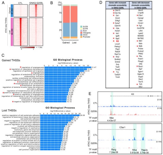 (A). Genomic sites with altered chromatin accessibility (THSSs) in vascular malformations of mice injected with MS1 cells expressing GNAQ-Q209L (GNAQ-Q209L) or not (CTL). (B). Distribution of differential ATAC-seq peaks with respect to gene features. (C). Gene ontology biological process enrichment analysis of genes containing differential ATAC-seq peaks. Asterisk denotes pathways involved in angiogenesis or vasculogenesis. (D). List of genes with differential chromatin accessibility; Asterisk denotes genes involved in angiogenesis or vasculogenesis. (E). Examples of differential ATAC-seq peaks in two genes related to angiogenesis.