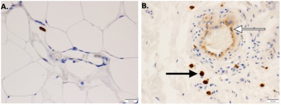 (A). c-Kit staining in control dermal endothelial cells from normal skin. (10×). (B). c-Kit positive staining in endothelial cells (white arrow) and perivascular mast cells (black arrow) in human SWS tissue. (10×).
