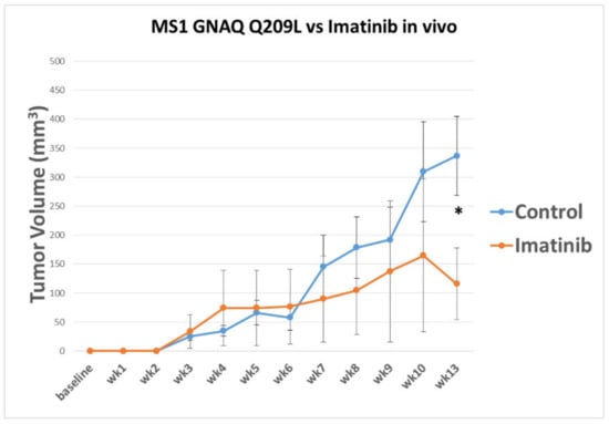 Imatinib treatment results in reduced tumor volume over 13 weeks. Mice were inoculated with MS1 GNAQ Q209L (1 × 106 cells) and then treated with imatinib via IP administration three times a week at a concentration of 50 mg/kg. Tumor growth was compared to control vehicle (sterile water). Results indicate a possible reduction in tumor growth over period of observance. Asterisk denotes significance (N = 5, p-value = 0.04, * p ≤ 0.05).