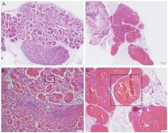 Hematoxylin and eosin of MS 1 control in vivo compared to MS1 GNAQ Q209L (A). Control (10×) (B). Control (40×) (C). GNAQ Q209L (10×) (D). GNAQ Q209L (40×) Note the increased size of lumens in cells expressing GNAQ Q209L versus the solid pattern of cells in the MS1 parental lesions.