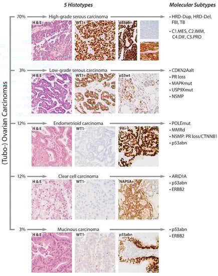 The subclassification of ovarian carcinomas is now based on a hierarchical approach; the first step is to subclassify based on traditional histopathological phenotypes into histotypes. Histotypes are considered different diseases based on the cell of origin, molecular alterations, clinical behavior and management [,]. Precise histotyping is now supported by ancillary diagnostic immunohistochemical (IHC) markers []. Although refined by molecular advancements, the phenotype-based histotype classification has been relatively stable over several decades. In the second step, histotypes are then further stratified into molecular subtypes (Figure 1). Molecular subtypes and predictive biomarker tests are currently evolving.