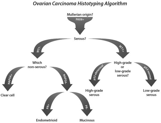 - Köbel, M.; Rahimi, K.; Rambau, P.F.; Naugler, C.; Le Page, C.; Meunier, L.; de Ladurantaye, M.; Lee, S.; Leung, S.; Goode, E.L.; et al. An Immunohistochemical Algorithm for Ovarian Carcinoma Typing. Int. J. Gynecol. Pathol. 2016, 35, 430–441. [Google Scholar] [CrossRef] [Green Version]
