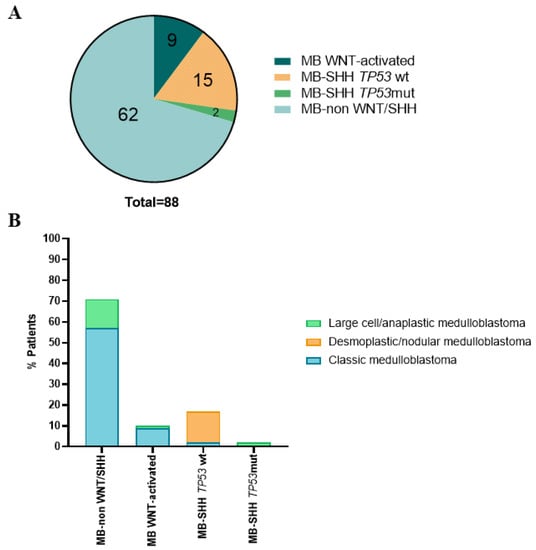 The four molecular subgroups varied in histological distribution. Histological type was associated with molecular group: the majority of the non-WNT/SHH MB had classic histology and 10% of all the cases had large cell/anaplastic histology. All the WNT-activated MB subgroup presented classic histology except for one case, which had large cell/anaplastic histology. For the SHH-MB TP53 wt subgroup, all the cases showed desmoplastic/nodular histology except two cases that were classic MB. Finally, all the cases of SHH-MB TP53 mut exhibited large cell/anaplastic histology (Figure 1B and Supplementary Table S1).