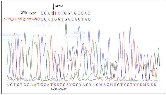 One of the mutations found in CTNBB1 resulted in the in-frame deletion of a TCT codon and the loss of Ser37 residue in the variant β-catenin protein (c.109-111del (p.Ser37del)) (Figure 2). To the best of our knowledge, this mutation has not been described in MB (Table 1). Figure 3A illustrates the N-terminal β-catenin residues targeted by mutation in our cohort of pediatric MB, including the novel variant described in this study. In Figure 3B, the frequency of amino acid substitutions in this region of β-catenin in pediatric MB is shown, as retrieved from https://pecan.stjude.cloud (accessed on 1 December 2021). Since the function of β-catenin p.Ser37del (ΔS37) is uncertain, we studied this variant more in detail.