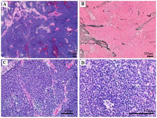 Hematoxylin-eosin staining of tumor specimen. Histological sections display tumoral (A): Hematoxylin-eosin stain, 40× magnification and no reticulin net enhancement (B): Reticulin stain, 100× magnification. No anaplastic or large cell changes are noticeable. (C): Hematoxylin-eosin, 200× magnification and (D): Hematoxylin-eosin, 400× magnification.
