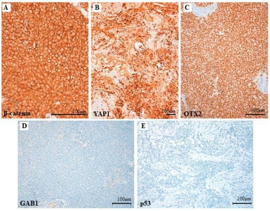 Tumor tissue samples from all the patients were fixed in buffered 4% formalin, embedded in paraffin, and stained according to standard procedures. The immunohistochemistry followed standardized methods in the Hospital Universitario de Cruces Pathology Lab, Spain. We used β-catenin (14, Roche Tissue Diagnostics, Roche Ltd.), p53 (Bp53-11, Roche Tissue Diagnostics, Roche Ltd., Oro Valley, AZ, USA), YAP1 (EP1674Y, Abcam Ltd.), GAB1 (H7, Santa Cruz Biotechnology, Inc., Dallas, TX, USA), and OTX2 (1H12C4B5, Thermo Fisher Scientific, Waltham, MA, USA) as primary antibodies. Immunohistochemical staining was performed in an automated immunostainer (BenchMark ULTRA Slide Stainer IHC/ISH System, Roche Tissue Diagnostics, Ventana Medical Systems, Roche Ltd. Oro Valley, AZ, USA).