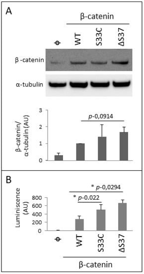 Ser37 mutations comprised about 10% of the known ß-catenin mutations, with Ser37Phe, Ser37Cys, and Ser37Ala being the more frequent substitutions. It has been recently described as small molecules that bind to non-phosphorylated or Ser37Ala mutant β-catenin and enhance their binding to β-TrCP, representing a therapeutic strategy to target proteins defective in ligase binding, ubiquitylation, and degradation [49,50]. Our results suggest that mutation p.Ser37del results in altered β-catenin phosphorylation, increased protein stabilization, and nuclear accumulation, contributing to tumorigenesis by the transcriptional activation of gene targets of the WNT/β-catenin pathway.