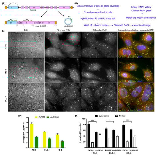 Visualizing circZNF609 using CircFISH. (A) Schematic of circFISH for the simultaneous imaging of linear and circular ZNF609. The binding of the PL and PC probes on the linear and circular isoforms, respectively, of ZNF609 is shown by straight lines ending in filled circles. (B) Standard protocol for the circFISH method. (C) Representative image panel for circFISH for ZNF609 in A549, HS-5 and DLD-1 cells with the PL and PC probes. From the left: DIC; raw merged z stacks of cells for PL probes labeled with TR; raw merged z stacks of cells for PC probes labeled with Cy5; and a merged image of the two channels with TR spots pseudo-colored red and Cy5 pseudo-colored green, overlaid on DAPI with MATLAB-interpreted spots. Full-length linear, circular and fragmented linear RNA is represented as yellow, green, and red spots, respectively. (D) Quantification of ZNF609 and circZNF609 signals after MATLAB analysis. The columns represent the average ZNF609 and circZNF609 RNA molecules per cell, as analyzed in MATLAB across the different cell lines. (E) Average relative nuclear and cytoplasmic localization of ZNF609 and circZNF609 across the different cell lines. The error bars indicate the 95% confidence interval for at least 100 cells. * Indicates a significant difference with a p-value < 0.05. *** Indicates a significant difference with a p-value < 0.001. The scale bar is 5 μm.