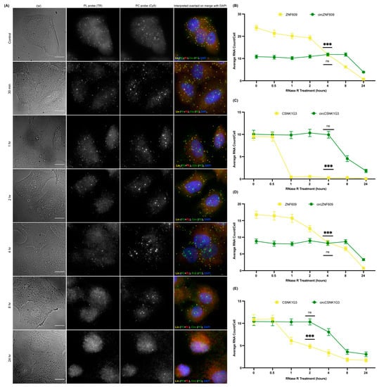 Optimization of in situ RNase R treatment for circFISH. (A) Representative image panel of A549 cells after 0 min, 30 min, 1 h, 2 h, 4 h, 8 h, and 24 h treatment (from top to bottom) with RNase R before hybridization with PL and PC ZNF609 probes. Columns from the left: DIC; raw merged z stacks of cells for PL probes labeled with TR; raw merged z stacks of cells for PC probes labeled with Cy5; and a merged image of the two channels with TR spots pseudo-colored red and Cy5 pseudo-colored green, overlaid on DAPI, with MATLAB-interpreted spots showing linear RNA as yellow and circular RNA as green. (B–E) Quantification of the average ZNF609, circZNF609, CSNK1G3, and circCSNK1G3 RNA molecules per cell after MATLAB analysis at each RNase R timepoint in the A549 (B,C) and DLD-1 (D,E) cells, respectively. The error bars indicate the 95% confidence interval for at least 100 cells. *** Indicates a significant difference between 0 mins and the particular timepoint, with a p-value < 0.001, and ns indicates no significant difference. The scale bar is 5 μm.