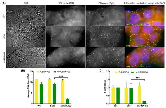 In order to confirm that the spots obtained by the PC probe set alone are indeed circRNAs and not just degraded or broken fragments of linear RNA, we incorporated an RNase R treatment in our circFISH assay. RNase R is a 5′–3′ exoribonuclease that digests only linear RNA but not circular RNAs, which are resistant to this enzyme [23,37,38]. There are several reports on the use of RNase R on isolated RNA, but its use in fixed cells and in situ has not been extensively reported [28]. Prolonged exposures to RNase R can also degrade circRNAs due to the formation of spontaneous nicks in the circRNAs over time, and due to the inherently unstable nature of the RNAs [39]. Therefore, the incubation time and reaction conditions need to be optimized for in situ RNase R treatment [40]. For this purpose, we treated the fixed and permeabilized cells with RNase R solution prepared in nuclease-free RNase R buffer. We incubated the cells for different periods of time, and performed circFISH after each time interval. We imaged two different pairs of linear and circRNAs, ZNF609 and CSNK1G3 (casein kinase 1 gamma 3), in two different cell lines: A549 and DLD-1. The CSNK1G3 gene has 13 exons; exons 2, 3, and 4 undergo back-splicing as circCSNK1G3, which is reported to play antagonistic roles to that of the product of linear CSNK1G3 RNA (Figure S2A) [41,42]. Therefore, we designed PL to bind to exons 6 to 12, and a PC probe set to bind to exons 2 to 4 of CSNK1G3. CircFISH was able to accurately visualize and measure the effect of RNase R treatment compared to untreated cells (control) (Figure 2A). We found that different cell lines, as well as different RNAs in the same cell line, vary in incubation time from 1 to 4 h to remove most of the linear RNAs while retaining circRNAs (supplementary Figures S2B, S3 and S4). However, upon statistical analysis, we concluded that cells can be treated with RNase R for up to 4 h, leading to a minimal change in circRNA and a significant loss of linear RNA (Figure 2B) for both circRNAs in multiple cell lines (Figure 2B–E). These results prove the specificity of circFISH by validating that the green spots seen in Figure 1 indeed result from the circRNAs. Furthermore, we found that in situ RNase R treatment can also be performed after hybridization with probes, indicating that probe binding does not preclude the activity of RNase R on either linear or circular isoforms (supplementary Figure S5). This is due to the presence of the intrinsic ATP-dependent helicase activity of RNase R, which can degrade duplexes with 3′ overhangs [43]. Additionally, we further validated circFISH by specifically reducing the expression of circRNAs using shRNA targeting their BSJ. This allows for the selective reduction of circRNA while the linear RNA levels remain unchanged [18]. We sought to determine whether circFISH will be able to accurately quantify the decrease in the circRNA levels. For this purpose, the DLD-1 cells were transduced with a lentivirus construct expressing shRNA against circCSNK1G3 BSJ. The cells stably expressing the shRNA construct were selected and hybridized with both PC and PL probe sets for CSNK1G3. Control DLD-1 cells expressing a scrambled version of shRNA were also selected. As expected, circFISH was able visualize and quantify the loss of the circRNA signal in the cells expressing shRNA, while no change was observed in the levels of circRNA in the no-treatment control or the cells expressing the scrambled construct (Figure 3A,B). The knockdown of circRNA was also validated by qRT-PCR analysis (Figure 3C). These results further confirm the specificity of the circFISH method.