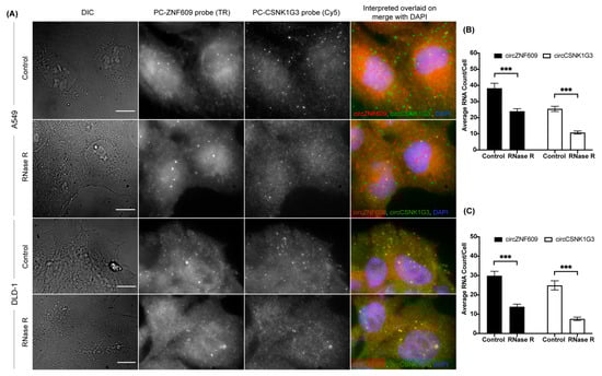 Multiplexing circFISH for the simultaneous visualization of multiple circRNAs using in-situ RNase R treatment. (A) A representative image panel of A549 and DLD-1 cells with no (labeled as Control) or 4 h of RNase R treatment (labeled as RNase R), with PC probes of ZNF609 and CSNK1G3. Columns from the left: DIC; raw merged z stacks of cells for the PC ZNF609 probes labeled with TR; raw merged z stacks of cells for the PC CSNK1G3 probes labeled with Cy5; and a merged image of the two channels with the TR spots colored red and Cy5 colored green, overlaid on DAPI with MATLAB-interpreted spots showing circZNF609 as red and circCSNK1G3 as green. (B,C) Quantification of circZNF609 and circCSNK1G3 signals in the control, and RNase R-treated A549 and DLD -1 cells, respectively. The error bars indicate the 95% confidence interval for at least 100 cells. *** Indicates a significant difference with a p-value < 0.001. The scale bar is 5 μm.