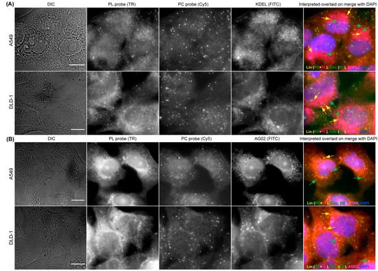 As the functions of circRNAs are only beginning to be characterized, it is becoming pivotal to acquire an imaging method that can be combined with other cellular staining—such as nucleic acid staining and immunofluorescence (IFA)—so that the circRNAs’ interactions with proteins and other nucleic acids can be visualized and validated. We previously optimized smFISH in combination with IFA and nucleic acid staining in various biological systems [44]. Utilizing DAPI staining during the mounting of circFISH samples, we can clearly define the nuclear and cytoplasmic distribution of circRNAs, as shown in Figure 1C. Furthermore, for the testing of the compatibility of circFISH with IFA, we used counterstains for cellular organelles and proteins in combination with circFISH. First, we used an antibody for KDEL (a marker for endoplasmic reticulum, ER) to label ER along with circFISH probe pairs (PL and PC) for ZNF609, and observed the colocalization of KDEL and linear/circular ZNF609 (Figure 5A). In order to further demonstrate the compatibility of circFISH with IFA, we used an antibody for the argonaute protein (AGO2) along with the circFISH probe pairs for CSNK1G3 RNA. We processed these images to identify the colocalization of AGO2 with linear and circular CSNK1G3 RNA, which is indicated by yellow and green arrows, respectively, in the last panel of Figure 5B. In order to demonstrate the flexibility of circFISH, we performed circFISH and IFA in alternative orders. In the first iteration, we first performed ZNF609 RNA circFISH as described above. After washing off the unbound probes, we conducted IFA using a KDEL biomarker for ER staining. Reversing the order in the second iteration, where IFA was followed by circFISH, yielded similar results (Supplementary Figure S6). These results confirmed that circFISH can be combined seamlessly with other cellular staining procedures, and hence is a useful tool for the functional characterization of circRNAs.