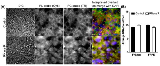 The optimization of in situ RNase R treatment in the circFISH assay also enables us to multiplex the circFISH assay. In order to demonstrate this, we treated the cells with RNase R for 4 h and then hybridized them using multiple PC probe sets, each of which were specific for a different circRNA and coupled with a distinct fluorophore. We used PC probe sets for circZNF609 coupled with Texas red and for circCSNK1G3 coupled with Cy5 together to hybridize A549 and DLD-1 cells with or without RNase R treatment (Figure 4A). In the case of untreated cells, the PC probe set should bind to both linear and circular RNAs. This was indeed the case, as we obtained a good consensus between the total RNAs identified by the PC probe set and the sum total of the linear and circRNAs, as shown in Figure 1. Next, the treatment of RNase R for 4 h eliminated the linear RNA, and we could identify both circRNAs together (Figure 4B,C). Thus, using the optimized RNase R treatment, we could reliably image multiple circRNAs simultaneously for their distribution and expression in individual cells. This multiplexing is limited only by the number of fluorophores that can be distinguished spectrally in the given imaging system.