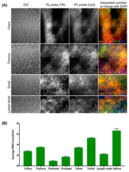 In order to develop an expression profile for circRNAs across multiple tissues, we used a frozen tissue array (Amsbio, Abingdon, UK, T6234433) with eight human tissues fixed on a slide [5,45]. We hybridized with a circPOK probe pair to verify whether circFISH can detect the endogenous circPOK expression levels in different tissues. We were able to detect distinct signals for circPOK RNAs in these tissues (Figure 7A,B). We noticed a differential expression of circPOK which correlates well with tissue expression atlas databases. Due to the single-molecule level sensitivity of circFISH, we were able to detect the expression of circPOK in tissues for which tissue expression database reports were lacking [25,46,47]. These findings confirm the accuracy and sensitivity of circFISH in providing contextual imaging of circRNAs in different sample types.