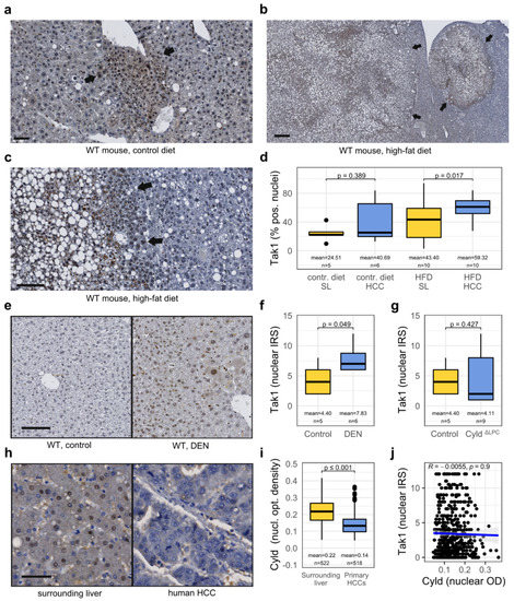 Tak1 is activated in a chemotoxic mouse model of HCC and is further induced upon high-fat, high-carbohydrate (HFD) feeding. (a) Tak1 immunohistochemistry of a DEN-induced mouse HCC with vascular invasion (arrows →). A control diet was fed. Scale bar: 50 µm. (b) Tak1 immunohistochemistry of two DEN-induced HCCs (arrows) in the liver of a mouse on a high-fat diet. Scale bar: 330 µm. (c) Tak1 immunohistochemistry of a DEN-induced HCC (arrows) in the liver of a mouse on a HFD. Scale bar: 100 µm. (d) Quantification of Tak1-positive nuclei in the liver of mice treated with DEN in combination with a control diet or HFD. (e) Tak1 immunostaining of the liver of a DEN + Phenobarbital treated mouse and a non-treated control. Scale bar: 250 µm. (f) Quantification of nuclear Tak1 staining in the liver of DEN + Phenobarbital-treated and non-treated control mice. (g) Quantification of nuclear Tak1 staining in CyldΔLPC and CyldFl/Fl control mice. (h) Cyld immunostaining of a human HCC and the surrounding liver tissue. Scale bar: 100 µm. (i) Quantification of nuclear Cyld staining in human HCCs and surrounding liver tissue. (j) Scatter plot of nuclear Cyld staining (x-axis) and nuclear Tak1 immunoreactivity (y-axis) in human HCCs (n = 515).