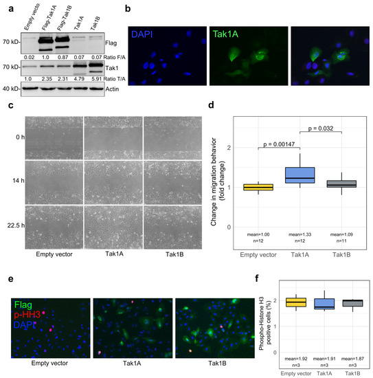 Overexpression of the Tak1A isoform resulted in significantly increased migratory activity. By contrast, upon overexpression of the full-length isoform Tak1B, migratory activity did not significantly differ from the mock-transfected control group (Figure 3c,d, Figure S4). The proliferation rate, as analyzed by phospho-histone H3 staining, did not show significant differences upon overexpression of either Tak1A or Tak1B, respectively (Figure 3e,f). Increased migratory behavior upon the upregulation of Tak1A may therefore constitute one mechanism for the malignancy of HCC cells and may be involved in tumor progression (Figure 1i,j).