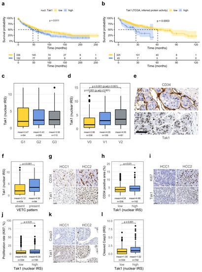 High Tak1 expression is associated with vascular invasion, vessels encapsulating tumor cell clusters, and unfavorable prognosis. (a) Kaplan–Meyer plot displaying overall survival with respect to high and low nuclear Tak1 protein expression as detected by immunohistochemistry (HR 1.34, 95% confidence interval 1.07–1.68, p = 0.011.) (b) Kaplan–Meyer plot displaying overall survival with respect to high and low estimated protein activity of Tak1 in the TCGA cohort (HR 2.31, 95% confidence interval 1.45–3.69, p ≤ 0.001). (c,d) Quantification of nuclear Tak1 immunoreactivity in human HCCs with respect to tumor grade (c) or vascular invasion (d). (e) Immunostaining of a HCC with VETC-pattern for CD34 (upper panel) and Tak1 (lower panel). (f) Quantification of nuclear Tak1 immunoreactivity in HCCs with respect to presence or absence of VETC-pattern. (g,i,k) Representative stainings for the indicated proteins with respect to high or low nuclear Tak1 staining. Scale bar: 50 µm. (h,j,l). Quantification of immunoreactivity of the indicated proteins with respect to high or low nuclear Tak1 staining.