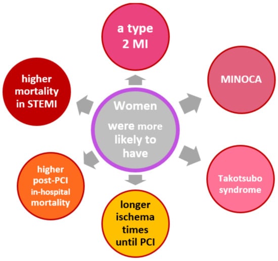 Gender-specific differences in patients with CAD [34]. Abbreviations: MI, myocardial infarction; MINOCA, MI with non-obstructive coronary arteries; PCI, percutaneous coronary intervention; STEMI, ST elevation myocardial infarction.