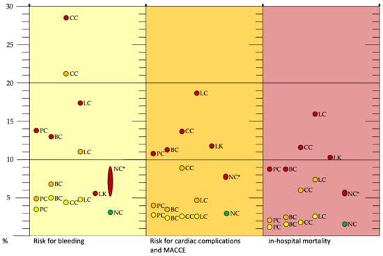 Risk of bleeding (yellow box), cardiac complications and MACCE (orange box), and in-hospital mortality (red box) during PCI and AMI in patients with prostate cancer, breast cancer, colorectal cancer, lung cancer, leukemia, and no cancer. Yellow dots: historical cancer, orange dots: current cancer, red dots: AMI, and green dots: PCI without cancer and AMI. * Non-cancer patients for comparison with source from different studies. Abbreviations: AMI, acute myocardial infarction; BC, breast cancer; CC, colorectal cancer; LC, lung cancer; LK, leukemia; MACCE, major adverse cardiac and cerebrovascular event; PCI, percutaneous coronary intervention; PC, prostate carcinoma; NC, non-cancer [7,14,28].