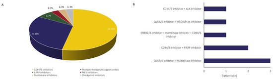 Experimental treatment opportunities identified with WGS. WGS identified experimental therapeutic opportunities for 30 patients (A), including eight patients with two experimental treatment opportunities (B).