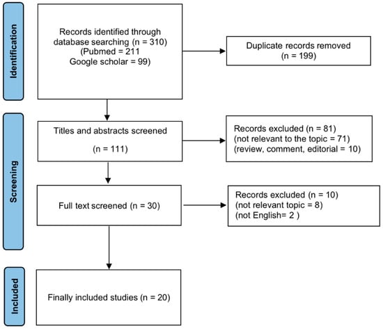 The process of selecting articles is depicted in the PRISMA diagram below (Figure 1). A total of 310 articles were found initially after searching the two databases. Then, 199 duplicate records were discovered and eliminated. The remaining 111 studies were further vetted for eligibility after the titles and abstracts were reviewed. Ultimately, 20 studies were included in the analysis [22,23,24,25,26,27,28,29,30,31,32,33,34,35,36,37,38,39,40,41].