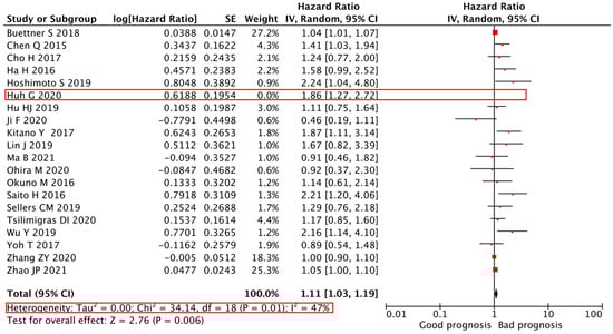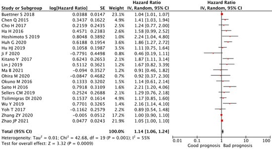 Between seventeen surgical and three non-surgical studies, the prognostic role of the PLR in OS was unfavorable in both subgroups (surgery group: HR = 1.09, 95% CI = 1.02–1.17, p = 0.02; non-surgical group: HR = 1.58, 95%, CI = 1.23–2.04, p = 0.0003). Of note, heterogeneity was not found to be significant in this subgroup analysis (surgery group: I2 = 48%, p = 0.01; non-surgical group: I2 = 0%, p = 0.43, Table 3, Figure S1B).