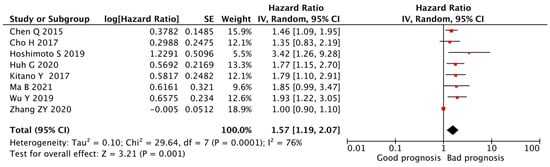 Five cohort studies showed that the PLR was an independent indicator of poor DFS in patients with CCA [28,29,31,32,36], whereas three publications detected no significant relationship between the PLR and DFS [22,23,36]. The pooled analysis of all eight studies revealed that a higher PLR was associated with worse DFS (HR = 1.57, 95% CI = 1.19–2.07, p < 0.01) with high heterogeneity (I2 = 76%, p < 0.01, Figure 3).