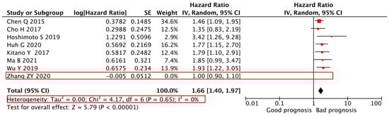 We adopted a random-effects model in the sensitivity analyses, deleting each study in each turn, to further determine the robustness of the prognostic role of the PLR in the DFS and OS of CCA. As shown in Figure 4 and Figure 5, the results of heterogeneity were changed when the studies of Zhang Z.Y. et al. [24] and Huh G. et al. [28] were deleted from the data set. The I2 decreased from 76 to 0% and 55 to 47%, respectively, but still displayed an unfavorable prognostic effect for DFS (HR = 1.66, 95% CI = 1.40–1.97, p < 0.01) and OS (HR = 1.11, 95% CI = 1.03–1.19, p < 0.01). These results indicate a significant contribution of these studies to the high heterogeneity regarding the outcome measures and further support the robustness of the PLR as a prognostic factor of DFS and OS.