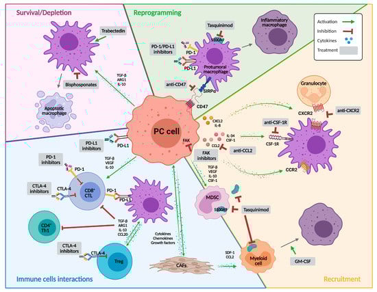 Regarding therapies affecting macrophage recruitment, there are treatments that have shown positive results in PC clinical trials, highlighting GM-CSF as a therapeutic vaccine adjuvant and CSF-1R as monotherapy, although trials in other solid tumors have suggested that combination therapy of both strategies could improve results obtained up to now. Conversely, although preclinical results indicated an important role of FAK in PC, to our knowledge, FAK inhibitors have not yet been tested in clinical trials in PC. The cytokine CCN3, secreted by PC cells, induces M2 polarization in RAW264.7 macrophages through the activation of the FAK/Akt/NF-κB pathway, leading to an increase in VEGF expression and promoting angiogenesis [172]. Likewise, high levels of macrophage inhibitory cytokine-1 (MIC-1), a member of the TGF-β superfamily, induced PC cell metastasis through the upregulation of the FAK–RhoA signaling pathway [173]. Overall, these results suggest that FAK inhibition could be a potential strategy in PC. In terms of macrophages survival/depletion approaches, it is worth mentioning that although bisphosphonates have been widely studied with controversial results, they should be taken into consideration as they are used to treat metastasis in the bone, the most frequent metastatic site for PC.
